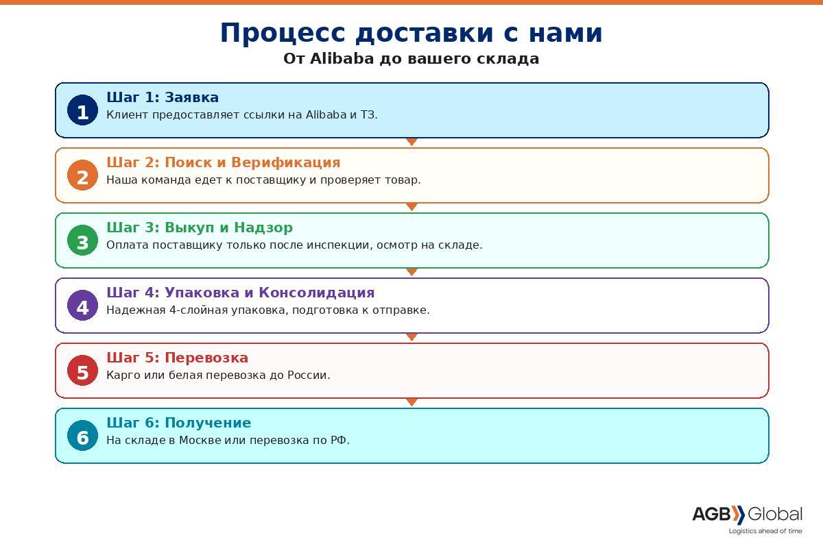 Работать с Alibaba в 2026 году без надежного агента - это игра в рулетку. Вы можете выиграть, но риски слишком высоки. Потеря денег, времени, репутации - все это реальные последствия отсутствия физического присутствия. Наша компания, AGB Global, предлагает вам решение: команду из 5+ специалистов в Гуанчжоу. Они работают как ваш личный отдел закупок. Мы делаем «Тотальный Контроль» на каждом этапе. Это гарантирует безопасность и эффективность ваших покупок. Не дайте расстоянию мешать успешному бизнесу.