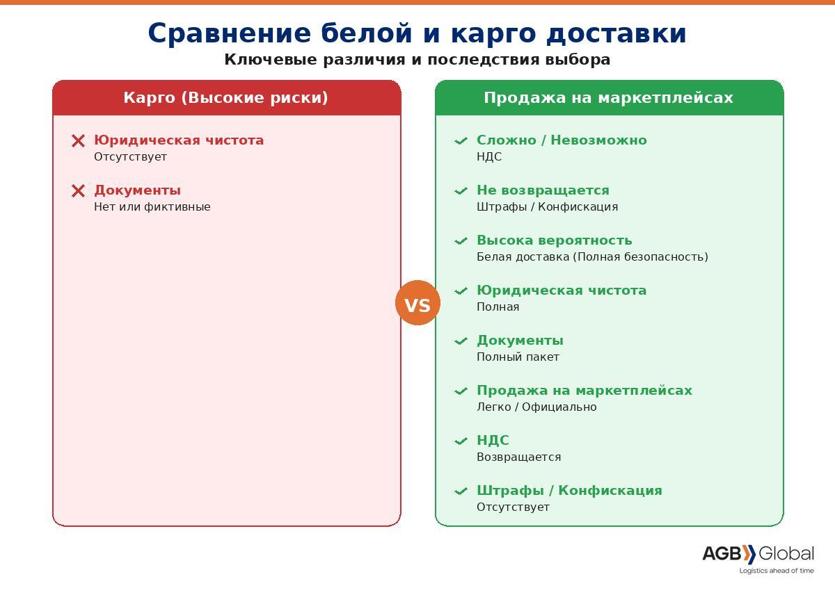 — Белая доставка из Китая - это легальный импорт с полным таможенным оформлением, уплатой всех пошлин и НДС. — Она гарантирует отсутствие штрафов, конфискации и проблем с налоговой, в отличие от карго. — AGB Global предлагает белую доставку под ключ с физическим осмотром товара на всех этапах. — Стоимость перевозки зависит от веса, объёма, типа товара и включает все официальные платежи. — Для перехода с карго на легальный импорт нужно учитывать оформление документов и сертификацию. — Главное преимущество - проверка товара руками на месте до оплаты поставщику.