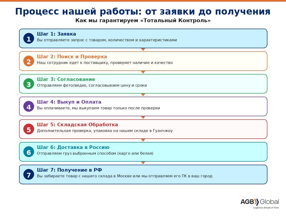 Представьте ситуацию: вы нашли нужный товар в Китае. Договорились с поставщиком, перевели деньги. А потом начался квест: языковой барьер, брак, потеря груза. Бесконечные задержки, не тот товар. Знакомо? Многие предприниматели, работая с Китаем напрямую, сталкиваются с такими проблемами. Они теряют миллионы и нервы. Но решение есть: профессиональный агент. Это ваш личный отдел закупок в Китае. В AGB Global мы отточили процесс за 4+ года. Он гарантирует не только выгодные условия, но и полную прозрачность на всех этапах. Мы здесь, чтобы помочь вам сделать покупки из Китая прибыльными и безопасными.